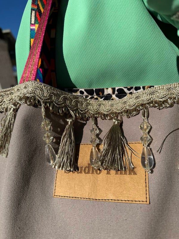 De tas is gemaakt van stevig canvas en gevoerd met luipaardprint stof. De bovenrand is afgewerkt met chique frandjeband. De hengsels zijn satijnachtig en aan twee kanten bedrukt. Dit geeft de tas een luxe uitstraling. Er zit een binnenvakje in voor een mobiele telefoon of sleutels. De tas heeft een magnetische sluiting. Als extra eyecatcher zit er een grote handgemaakte kwast aan de tas.