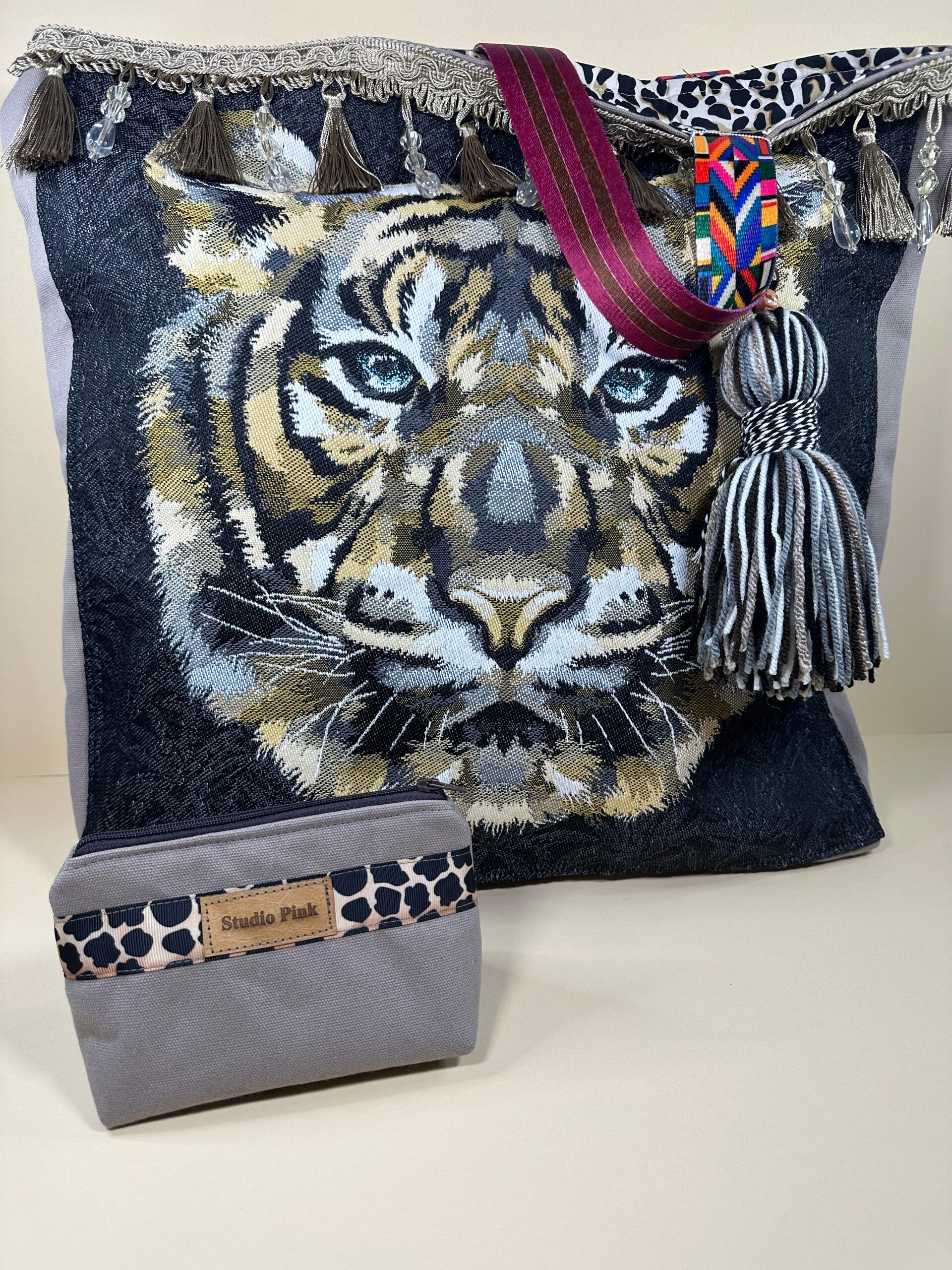 Het paneel met de tijger is prachtig geborduurd waardoor het dier je recht lijkt aan te kijken.