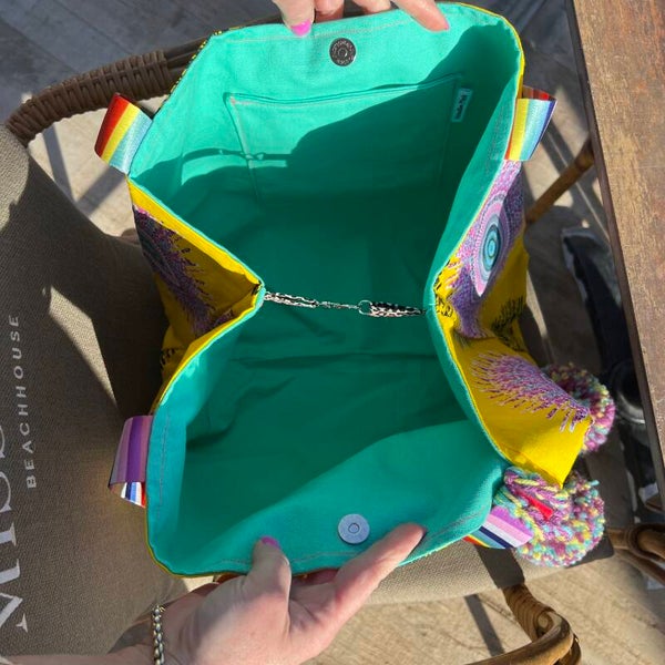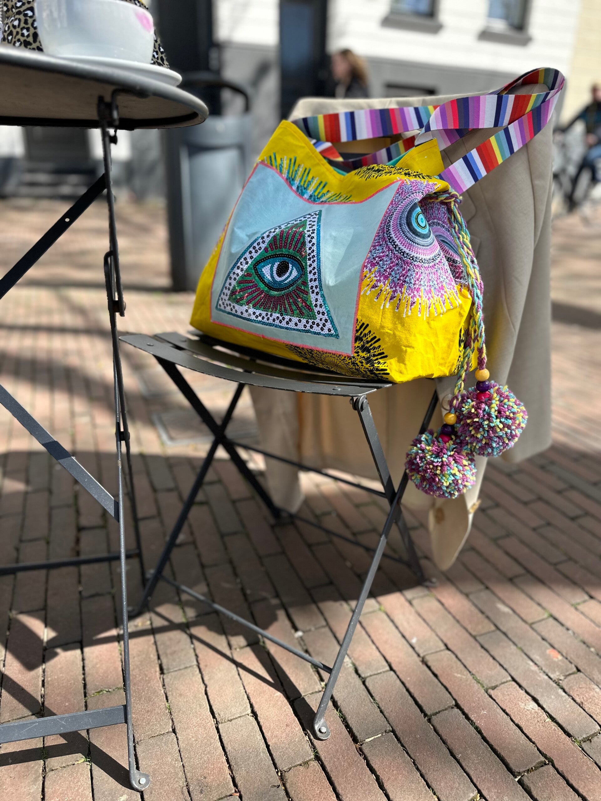 Ontdek onze geweldige collectie handgemaakte tassen. Elk stuk uniek en met liefde vervaardigd. Met een prachtige applicatie en een handgemaakte hanger met speelse pompons, stralen de tassen een authentieke bohemian vibe uit. Gemaakt van levendige Afrikaanse stoffen en gevoerd met duurzaam canvas, bieden ze niet alleen stijl maar ook functionaliteit. Elk exemplaar is ruim van formaat dus perfect om al je essentials mee te nemen. Grijp snel je kans want van elke tas is er maar één beschikbaar. Voeg een vleugje unieke schoonheid toe aan je outfit en bestel nu!