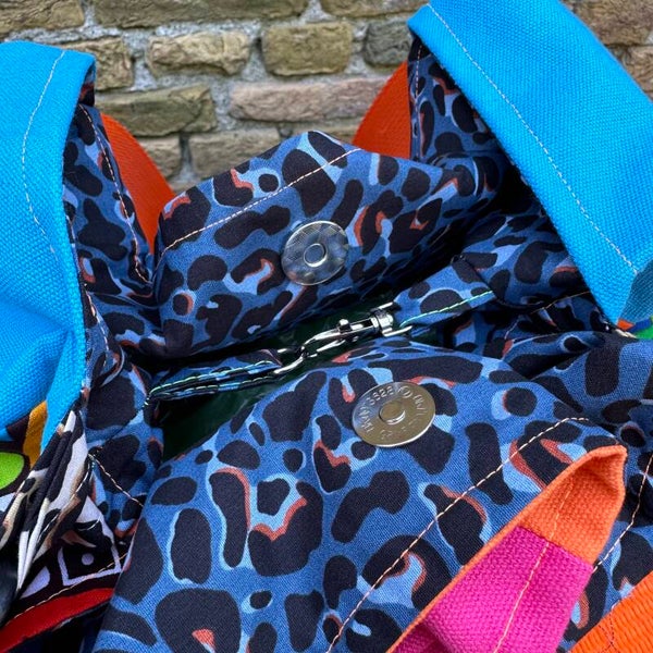 Deze kleurrijke Carry All tas is een unieke creatie gemaakt van verschillende resten stof. De tas is voorzien van zowel korte als lange hengsels voor flexibel draagcomfort. Bovendien is hij uitgerust met een magnetische sluiting, aangevuld met haakjes voor extra veiligheid, zodat je spullen altijd goed opgeborgen zijn. Een perfecte, duurzame keuze voor iedereen die houdt van een opvallende tas met een speels en artistiek karakter. Ideaal voor dagelijks gebruik of als stijlvolle boodschappentas. Ook zeker geschikt als Mom Bag!