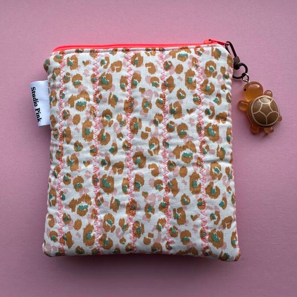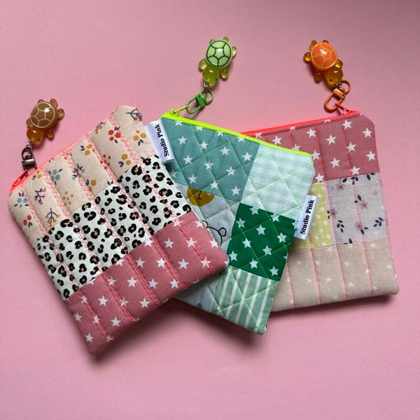 Elk etuitje is anders door de samenstelling van de stofjes, de kleur van de rits en het stiksel. Daarnaast zit er aan elk etuitje een hangertje met een katje. De Leftover Love-collectie van Studio Pink is gevuld met unieke etui’s en toilettassen. Allemaal handgemaakt en one of a kind.