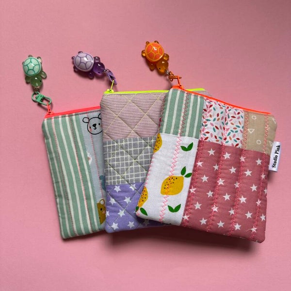 Elk etuitje is anders door de samenstelling van de stofjes, de kleur van de rits en het stiksel. Daarnaast zit er aan elk etuitje een hangertje met een katje. De Leftover Love-collectie van Studio Pink is gevuld met unieke etui’s en toilettassen. Allemaal handgemaakt en one of a kind.