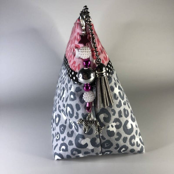 Stof: buitenstof luipaardprint in grijstinten en roze/donker roze. Voeringstof grijs met een wit hartje.