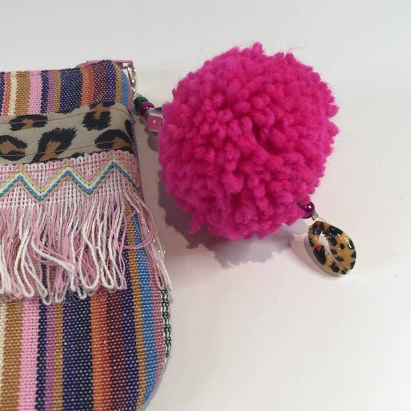 De clutch is gemaakt van stof met streepjes die is afgewerkt met luipaardprint band, kunstleer band en bolletjesband. Verde is de rits afgewerkt met een hangertje voorzien van trendy kraaltjes, schelpje en handgemaakte pompon.